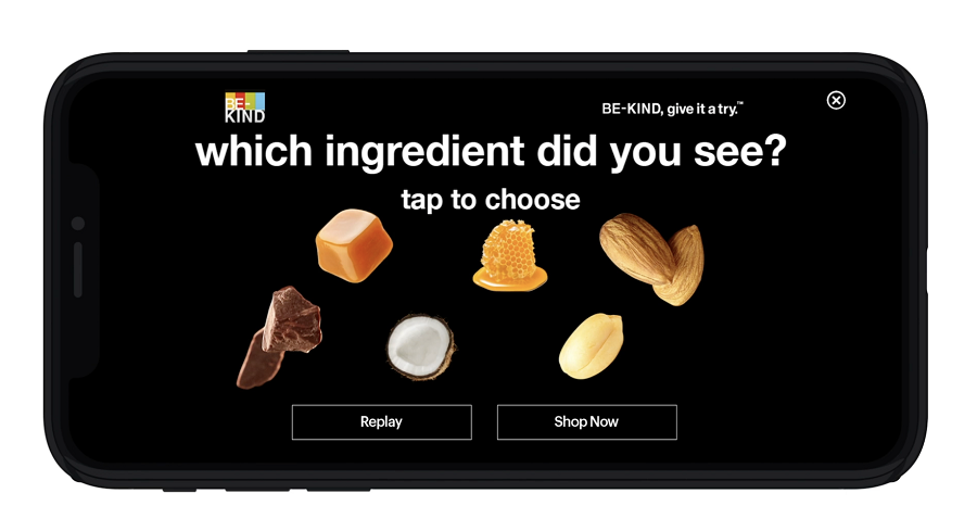 لم ترغب شركة مارس Mars في عرض فيديو جاهز للتشغيل وحسب، بل أرادت أن يتفاعل الجمهور المستهدف مع العلامة التجارية طوال تجربة الإعلان. ولهذا السبب، فبعد عرض فيديو “بي-كايند”Be-Kind ، يُمنَح المشاهد فرصة لاختيار أحد أشرطة “بي-كايند” Be-Kind الأربعة عن طريق التمرير على الشاشة لإظهار المكوّنات! بعد ذلك، يُطلب من المتلقّي حفظها بحيث يمكن للجمهور تحديد المكوّنات التي تظهر على الشاشة من خلال النقر على شاشاتهم والتفاعل مع الإعلان، وذلك بفضل تقنية البطاقة الديناميكية للمتلقّي النهائيDynamic End Card  ذات التفاعل العالي من آدكولوني AdColony. ومن خلال التجربة، نجحت مارس Mars في الاحتفاظ باهتمام الجمهور بالإعلان وتفاعل العلامة التجارية بدقّة عالية على حدّ من خلال إعلانات جذّابة تُستخدم فيها ميزتا النقر والتمرير. كما منحت الجمهور فرصة للتعرّف إلى ألواح “بي-كايند” Be-Kind  المغذّية من خلال البطاقة الديناميكية للمتلقّي النهائي. وبفضل تنفيذ آدكولوني AdColony الممتاز، حقّقت “بي-كايند”Be-Kind  معدّلات مشاركة عالية وأعلى بكثير من مقاطع الفيديو الجاهزة وغير التفاعلية.