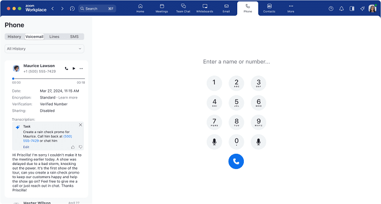 جرى حاليًا تفعيل فعاليّة Zoom Phone عن طريق قدرات AI Companion، بحيث صار بإمكان المستخدمين أن يوظّفوا الذكاء الاصطناعي القادر على تجديد المحتوى والأفكار، للمساعدة في جعل مكالماتهم منتجة أكثر. وبإمكان المُستخدمين، عبر استعمال “رفيق الذكاء الاصطناعي”، طلب ملخص ما بعد المكالمة والخطوات التالية، ليعمدوا إلى التركيز على المحادثة بحد عينها بدلاً من التلهّي في تدوين الملاحظات. وفي حال فاتتهم أي مكالمة مهمة، فإن من شأن تحديد أولويات البريد الصوتي أن يساعد في إبراز الرسائل العاجلة والمهمة، لجهة تقديم الأمور الملحّة أكثر وعرضها في أعلى قائمة الانتظار، علمًا أنّ استخراج المهمّة الواردة في البريد الصوتي.