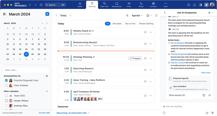 من بين التحديثات على منصة Zoom Meetings، سيرى المستخدمون علامة تبويب جديدة خاصة بالاجتماعات Meetings داخل تطبيق زووم، والتي تتيح للمستخدمين ربط سير العمل قبل الاجتماعات، وفي أثناءها وبعدها. قبل بدء الاجتماعات، يمكن للمستخدمين إرفاق مواد وجداول أعمال ما قبل الاجتماع بكل سهولة، والدردشة مع الحضور من خلال بطاقة الاجتماع. وخلال الاجتماعات، سيتمكن الحضور من الوصول بسرعة إلى المواد المرفقة مسبقًا، ومشاركتها والتعاون بشأنها، وذلك لتجنب إضاعة الوقت في البحث عن المواد المناسبة وإدارة مسألة الأذونات. أما ما بعد الاجتماعات، فيمكن استخدام علامة التبويب “الاجتماعات” الجديدة التي تسهّل الوصول إلى الملخصات والتسجيلات ومشاركتها، ومتابعة المحادثة في Team Chat، واستخدام AI Companion للعثور على معلومات مهمة عبر مسارات عمل مختلفة.