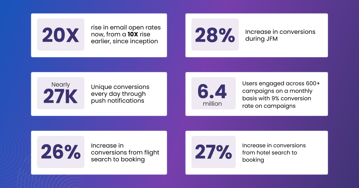 وبفضل التعاون مع Webengage، ازداد عدد التحويلات بنسبة 28%، وارتفعت التحويلات من عمليات البحث عن رحلات الطيران والفنادق بنسبة 26.5%. ومن جهته، قال أمانجيت سينغ مالهوترا، مدير إدارة علاقات العملاء في شركة ويجو: “ساهم فريق العمل في شركة WebEngage في تسهيل عملية التعاون بشكلٍ كبير. وخلال عدة أسابيع، أصبحنا مستعدين للتعامل مع حالات الاستخدام الأساسية لدينا، والتواصل مع العملاء بسرعة مذهلة”.