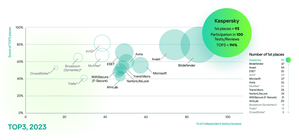 تمكنت منتجات كاسبرسكي في العام 2023 من الاستحواذ على مكانة رائدة وفق نتائج مقياس TOP3 الذي يختبر حلول الأمن الإلكتروني الخاصة بالأفراد والشركات. وخلال العام ذاته، شاركت كاسبرسكي في 100 اختبار ومراجعة مستقلة، وحصلت منتجاتها على المركز الأول 93 مرة، كما جاءت في المراكز الثلاثة الأولى في 94 مرة، لتحقق بذلك أعلى نتيجة على الإطلاق.