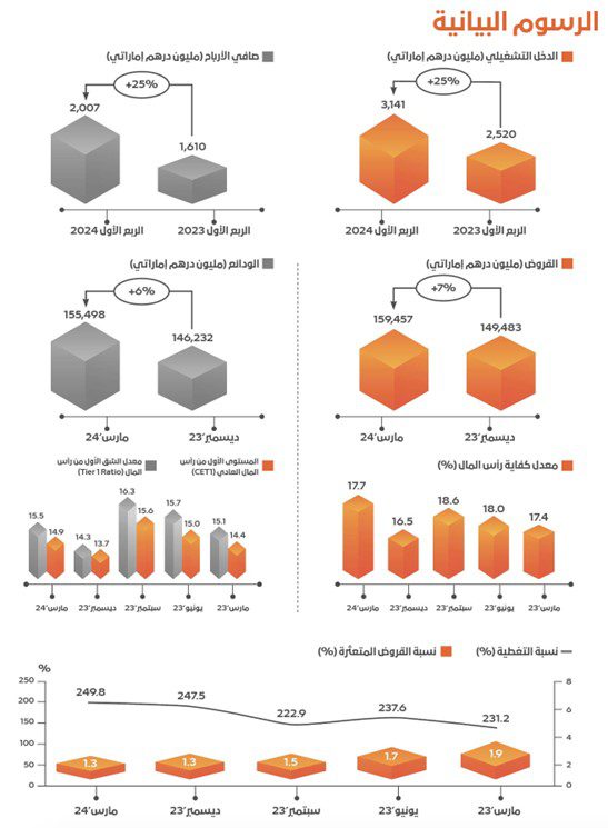 • صافي دخل الفوائد يواصل اتجاهه التصاعدي: زيادة بنسبة 23% في صافي دخل الفوائد بفضل التوسع الكبير للميزانية العمومية وهوامش الربح القوية من العملاء، في حين شهد الدخل من غير الفوائد زيادة ملحوظة بنسبة 29% مقارنة بالعام الماضي.