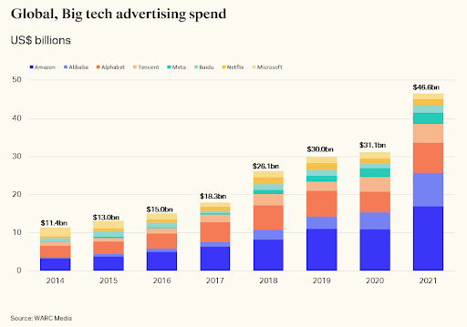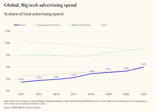 Big Tech’s spend on advertising is also growing faster (+49.4%) than categories such as media and publishing (+34%), technology and electronics (+26%) and retail (+21%). Analysis by WARC found that Big Tech contributed more than a tenth (10.4%) of all global ad spend growth in 2021.
