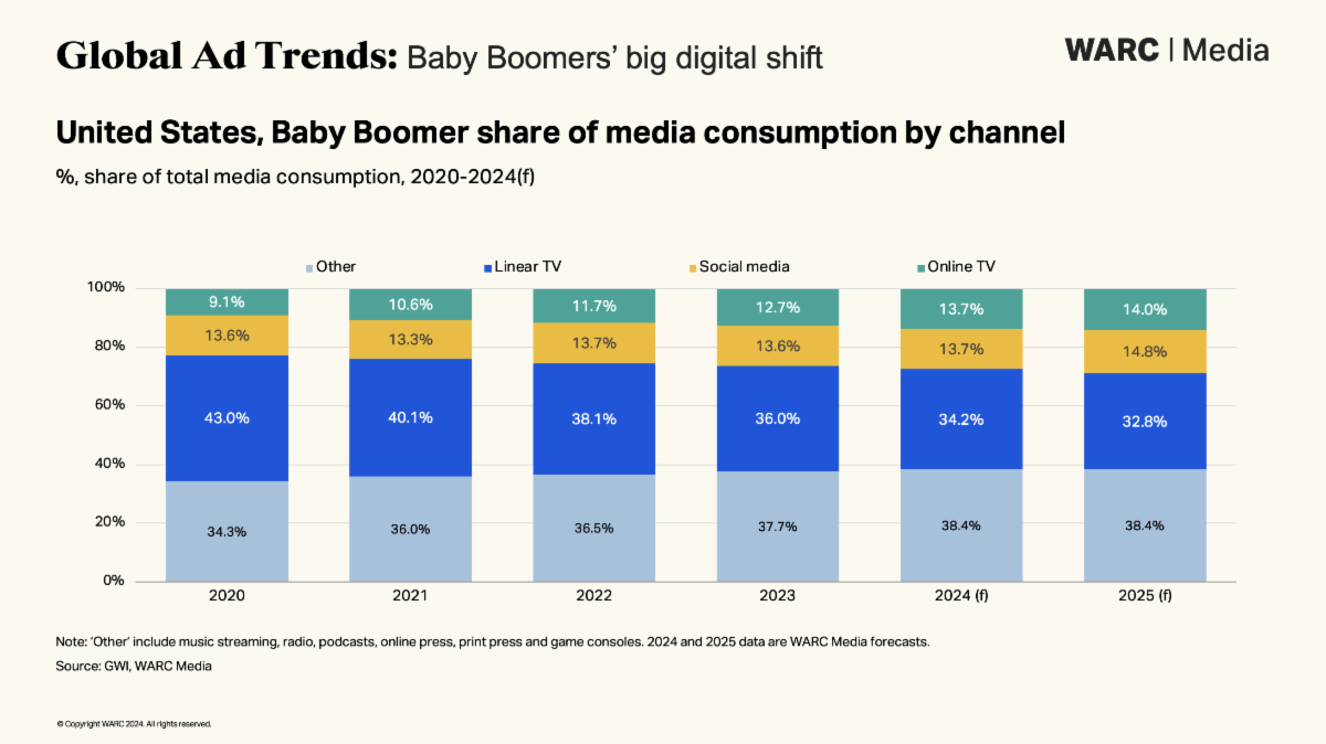 Alex Brownsell, Head of Content, WARC Media, says: “Boomers are embracing digital content. While brands obsess over Gen Z, the affluent Baby Boomer generation is undergoing a media revolution. This requires advertisers to revisit long-held assumptions, and ensure digital media plans are tailored to older consumers’ increasingly unique habits.”