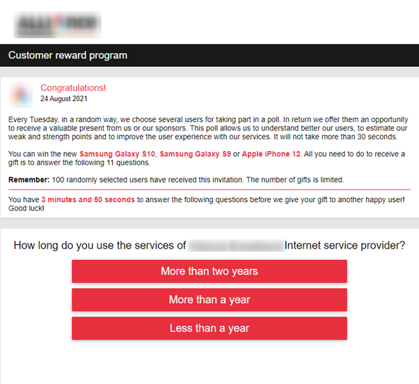 Fraudsters trap their victims by distributing invitations to partake in survey, after which the user would allegedly get a prize. Each such offer contains a link leading to the survey website. For “lead generation,” the threat actors use all possible legitimate digital marketing means: contextual advertising, advertising on legal and completely rogue sites, SMS, mailouts, and pop-up notifications. To build trust with their victims, scammers register look-alike domain names to the official ones. Less frequently, they were also seen adding links to the calendar and posts on social networks. After clicking the targeted link, a user gets in the so-called traffic cloaking, which enables cybercriminals to display different content to different users, based on certain user parameters.