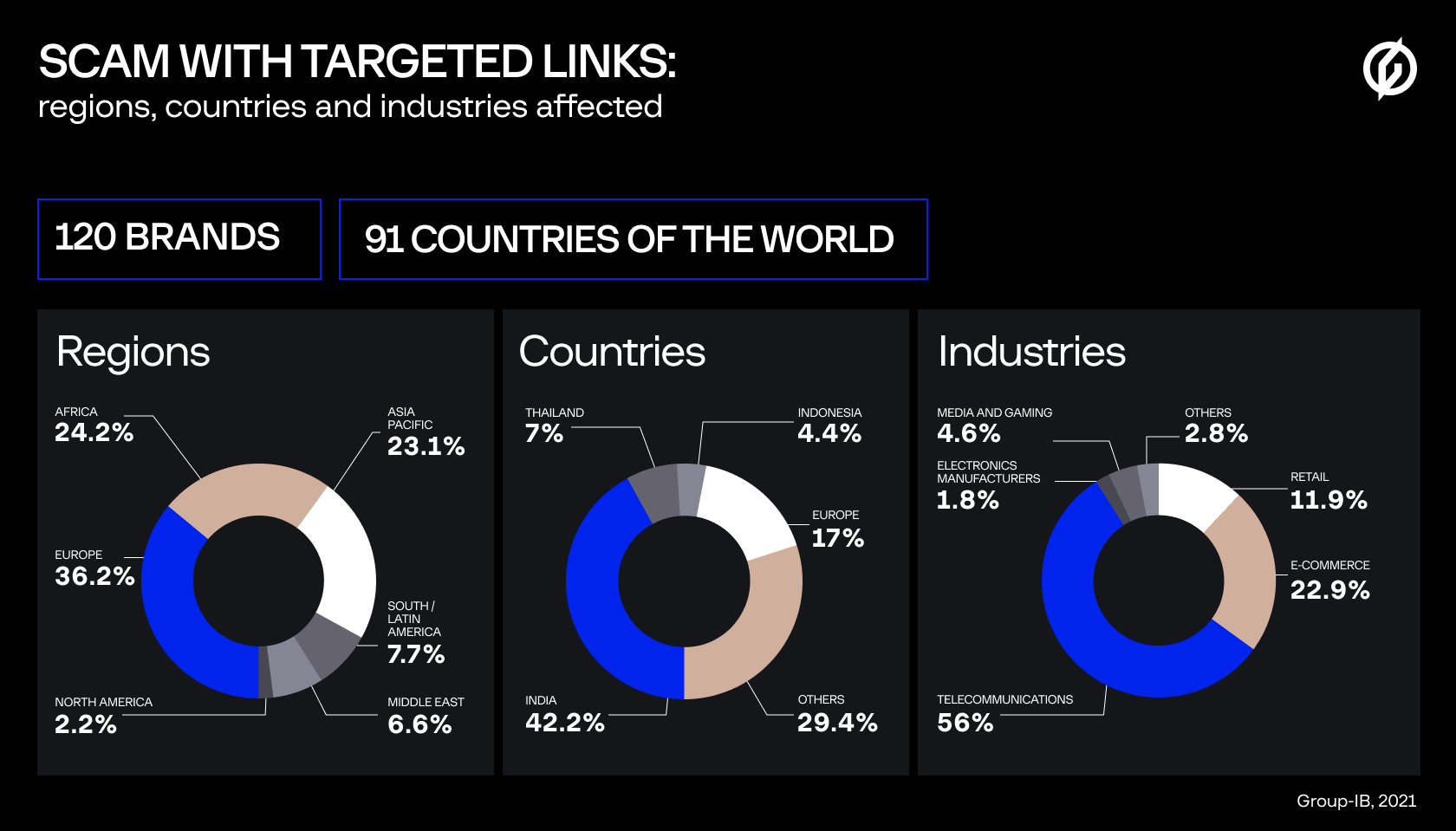 According to Group-IB DRP analysts, this type of fraud has been spotted in 91 countries, with cybercriminals exploiting at least 121 brands as bait. Based on the country of origin of the brands affected, the scam’s target regions are: Europe (36.3%), Africa (24.2%), and Asia (23.1%). In the Middle East alone, cybercriminals exploited 9 brands from Bahrain, Qatar, Oman, Kuwait and the UAE. Globally, cybercriminals mostly try to exploit the brands of leading telecommunications companies, which enjoy special “love” in this scheme, and make up more than 50% of the total number of brands exploited, followed by ecommerce and retail.