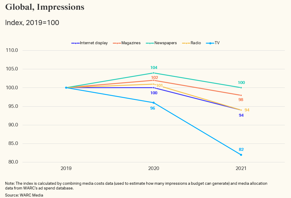 For some categories the impact is heightened. According to WARC Media data, advertisers in the food category spent on average 79.8% of their budgets on TV in 2019, and in the automotive category, 67.7%. If they were to have maintained that same level of investment, by 2021 the volume of impressions would have decreased by 18 percentage points.