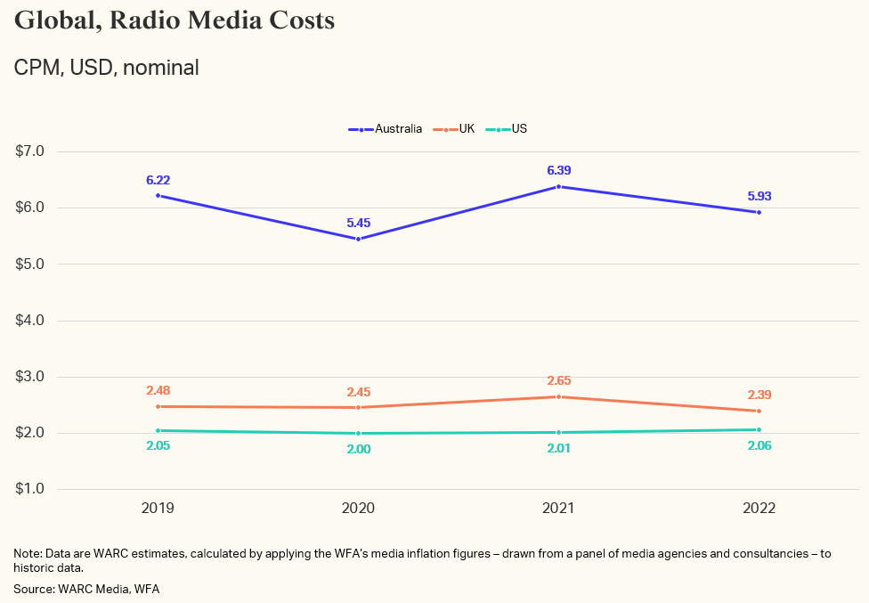 In Australia, the cost of radio media in 2022 remains 1.1% below pre-pandemic levels, while prices in the US are largely unchanged three years on.