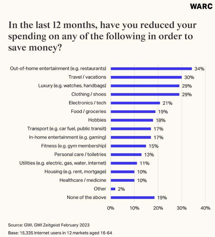 GWI data shows that globally two in five (40%) consumers are spending less money now compared to 2022 and price conscious consumers are forced to make tradeoffs as their purchasing power shrinks.