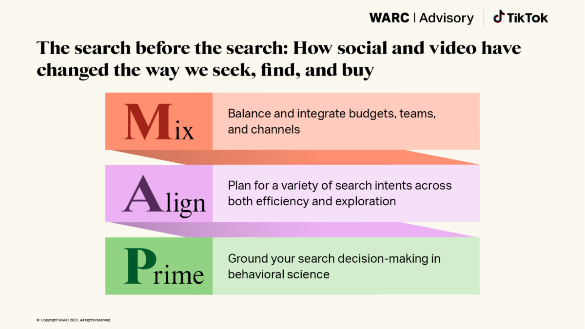 Mix: The future of search is multi-platform. To align search strategies with diverse consumer search habits, marketers should balance traditional and emerging platforms, such as social and video, to optimize each channel’s strengths whilst creating demand.