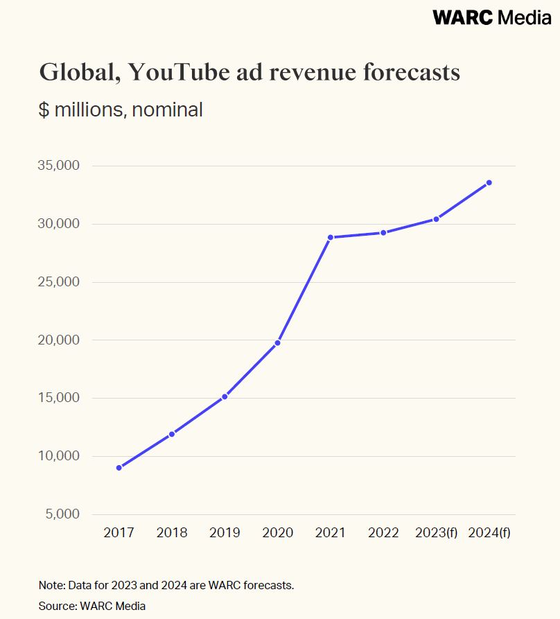 Alex Brownsell, Head of Content, WARC Media, says: “It’s been a tricky 12-month period for YouTube, which is increasingly battling on two fronts, against short-form video platforms like TikTok as well as long-form content streamers in the connected TV space. However, as trading conditions improve in digital advertising, YouTube can expect to see revenue growth improve.